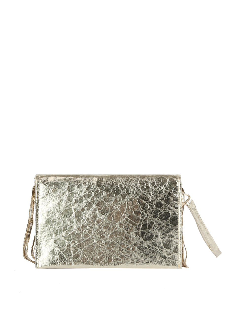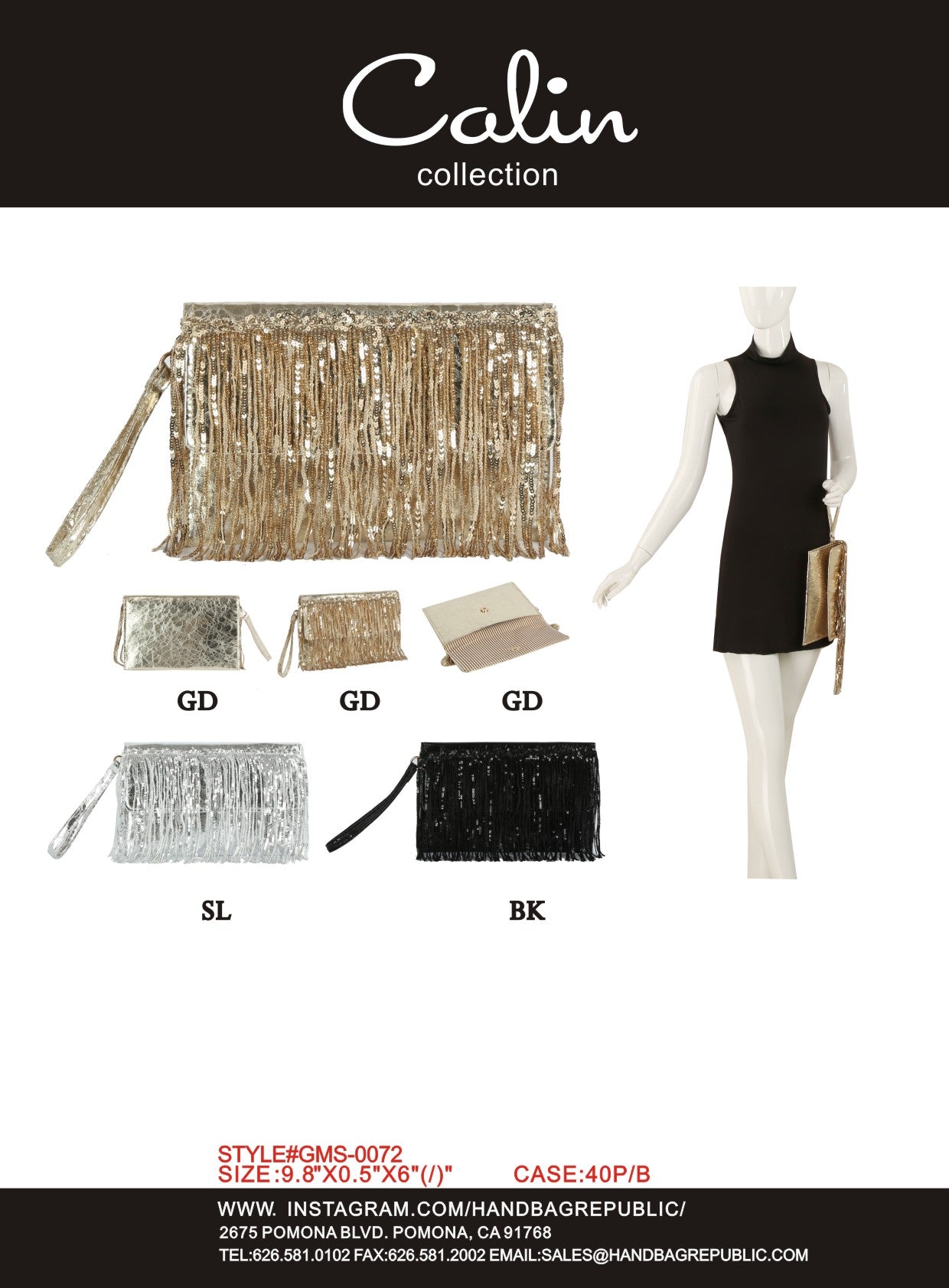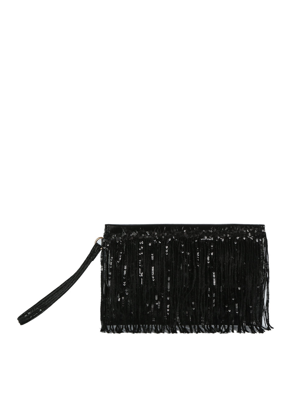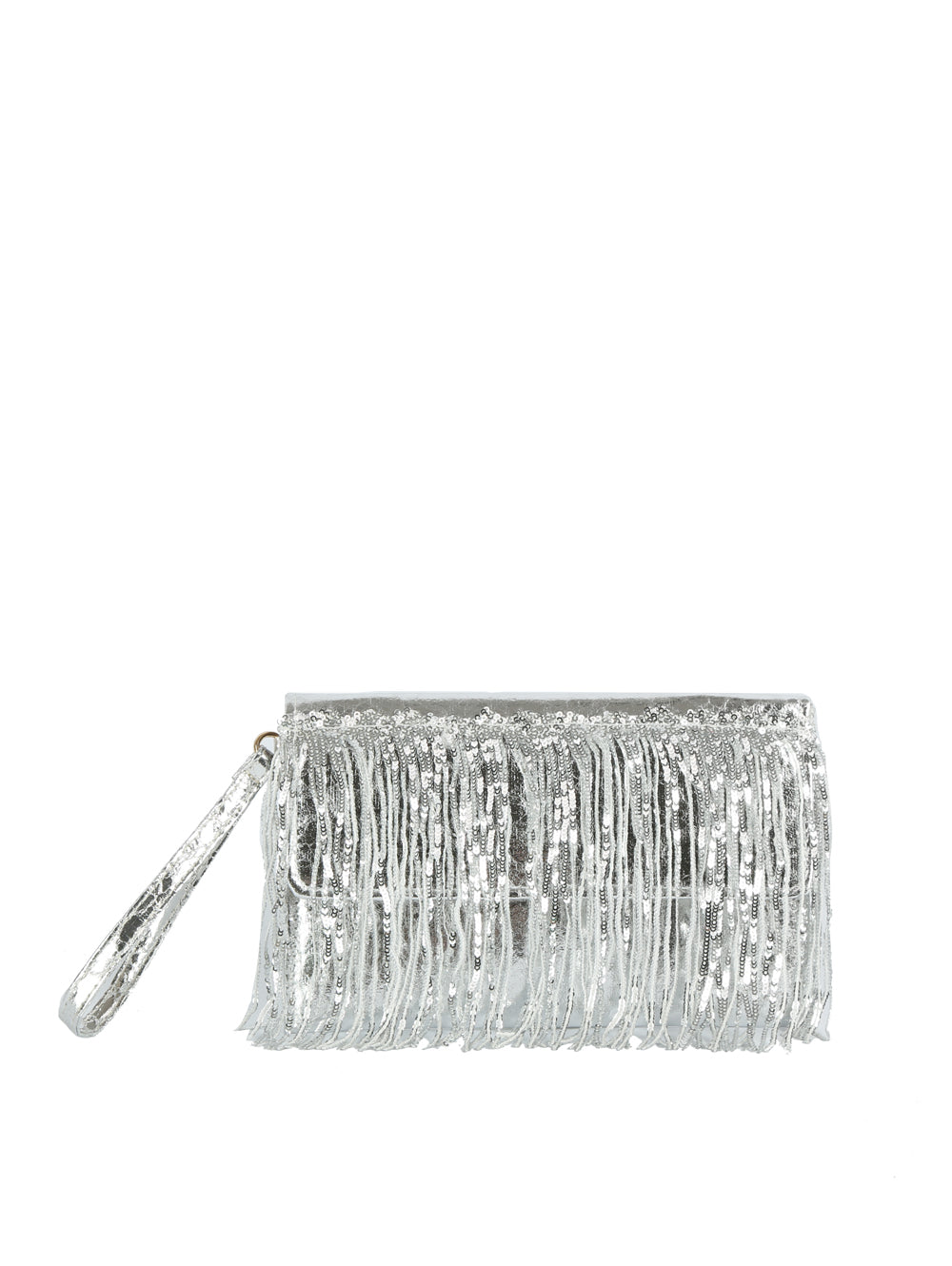 In summary, it's a striking, metallic-fringed clutch with a wristlet strap, designed to add movement and shimmer to an evening outfit.
