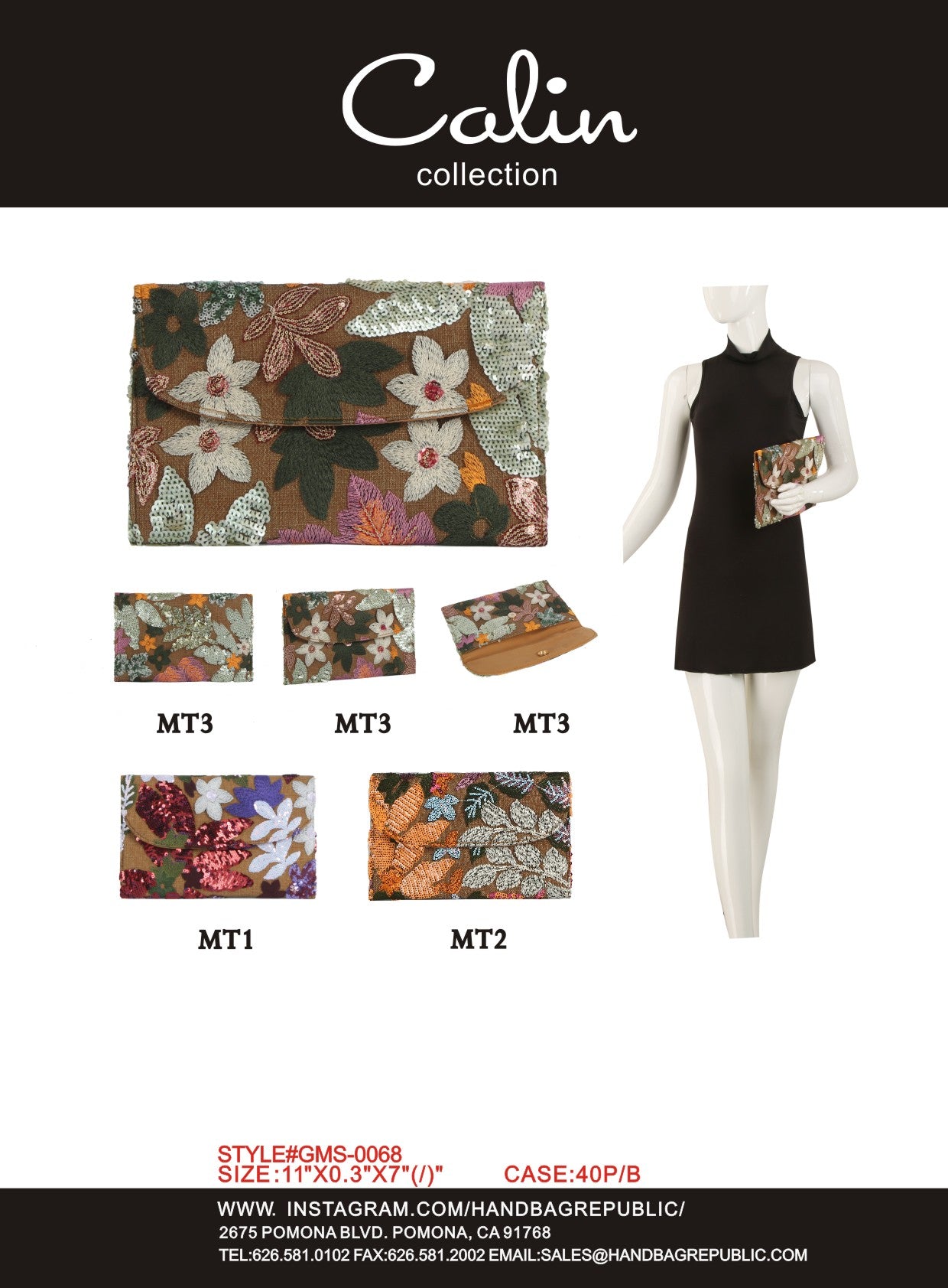 The clutch is offered in several distinct floral color palettes, denoted by codes: