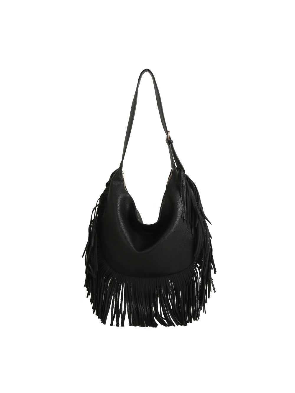 • Faux vegan leather • Light gold hardware • Top zip • Fringe Bottom •Adjustable Strap • Shoulder bag • Depth: 16 Height: 0.3 Length: 10.8