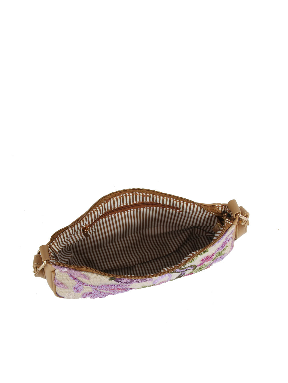 This is a stylish, small to medium-sized baguette or shoulder bag characterized by its mix of natural texture and glamorous floral embellishment.