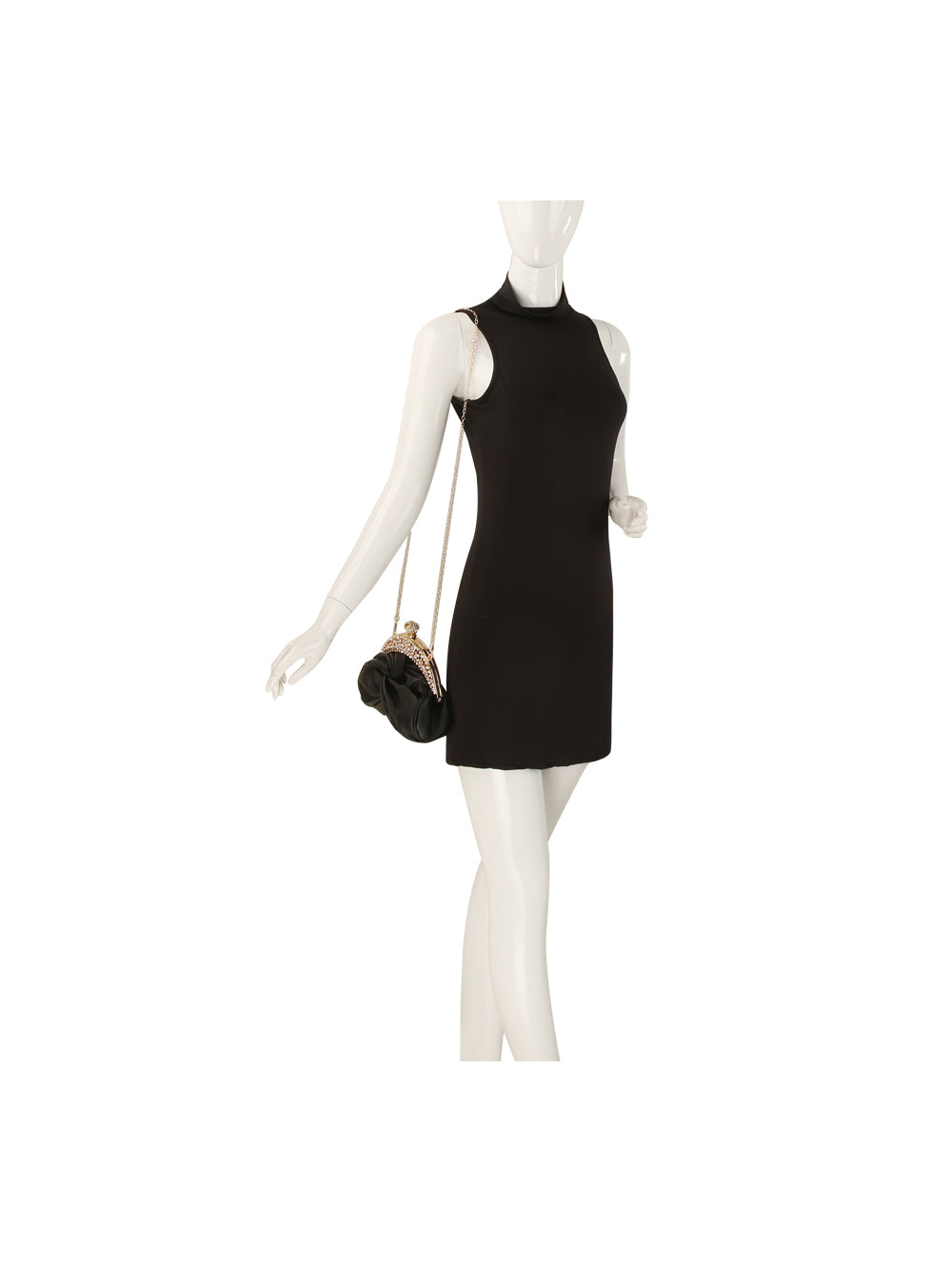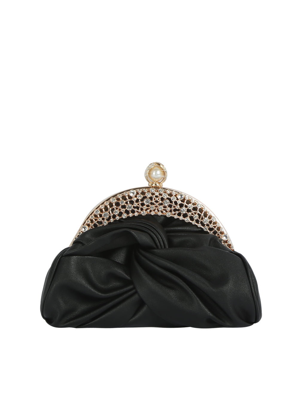 | • Satin Fabric • Light gold hardware • Detachable strap • Embellished with Rhinestones • structured metal frame closure • Shoulder bag • Depth: 7 Height: 0.5 Length: 9.5 |
