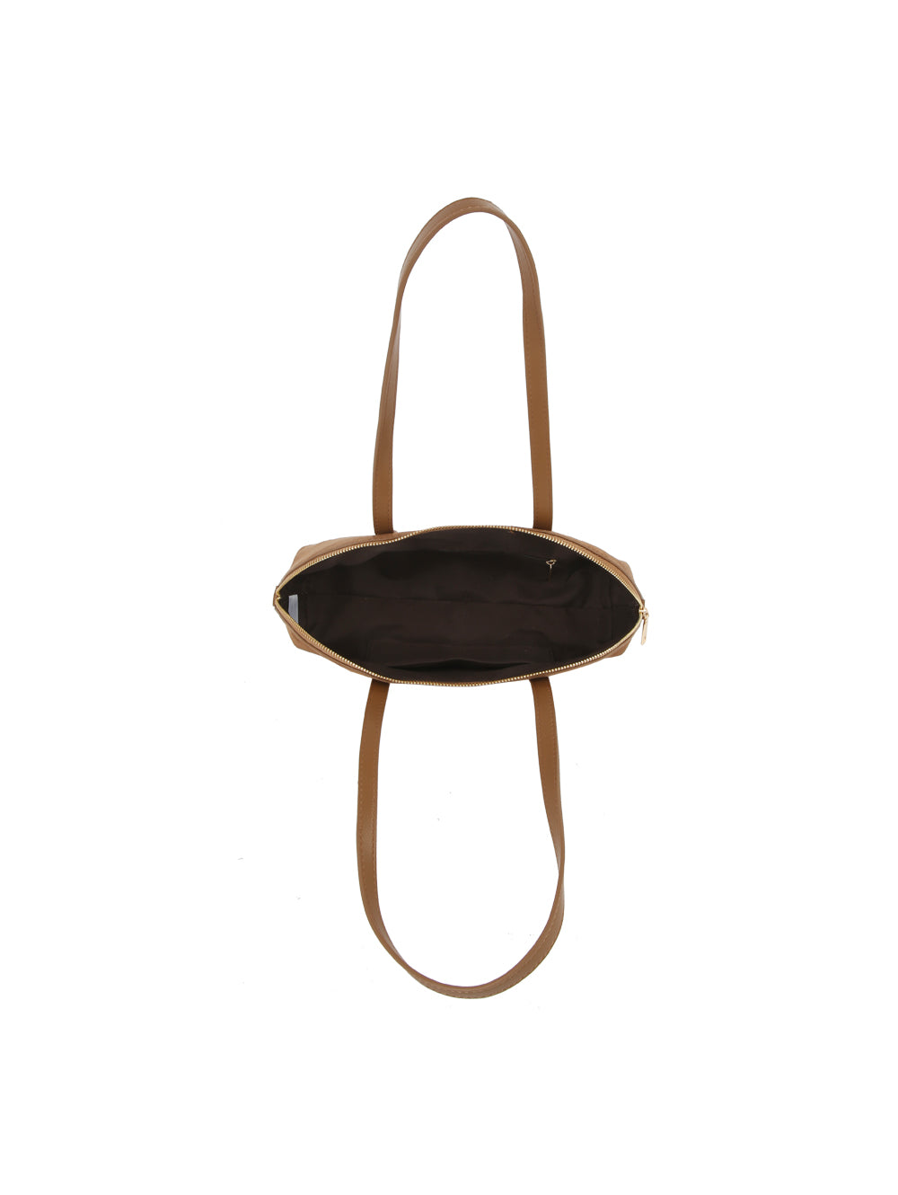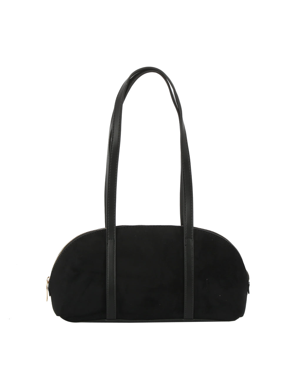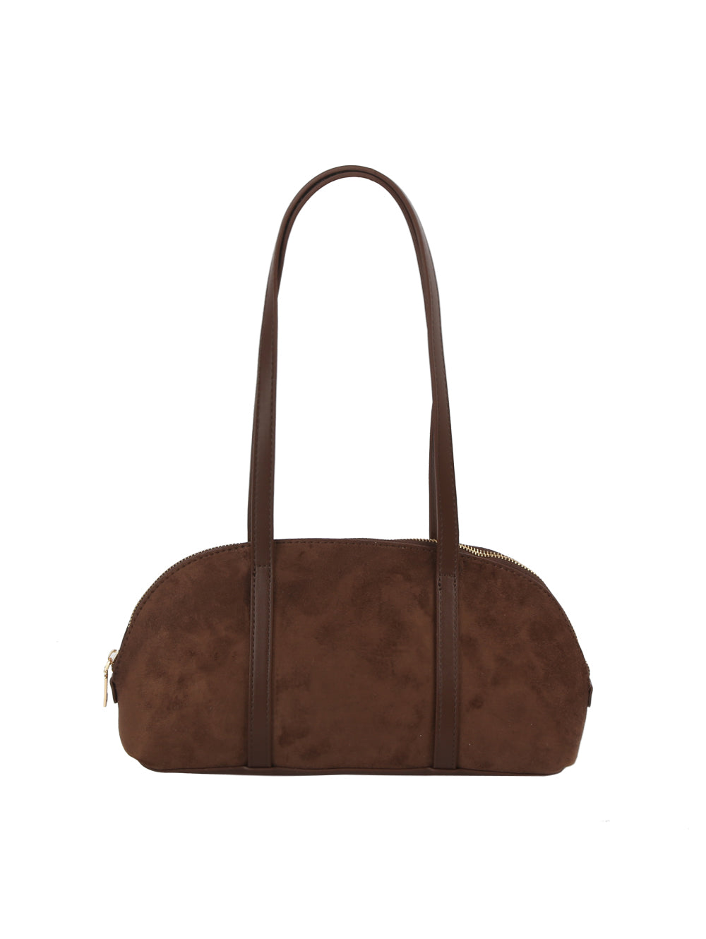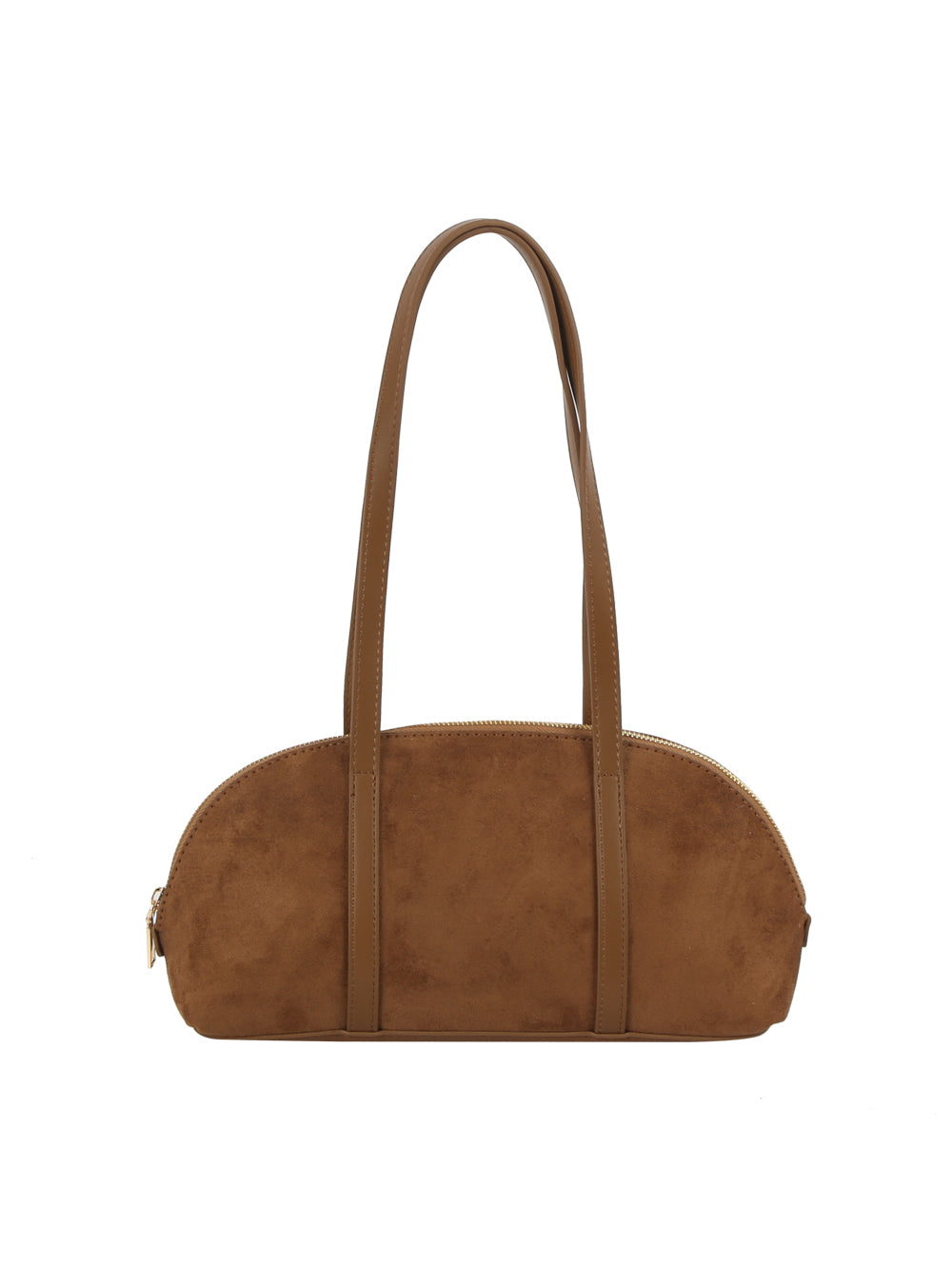 • Faux suede • Light brass hardware • Top zip • Shoulder bag • Depth: 6.5 Height: 3 Length: 13.75
