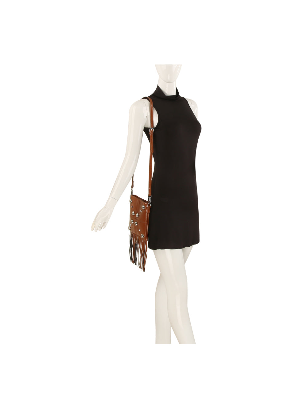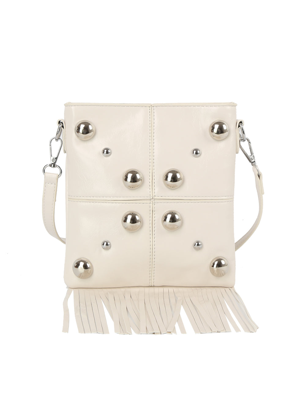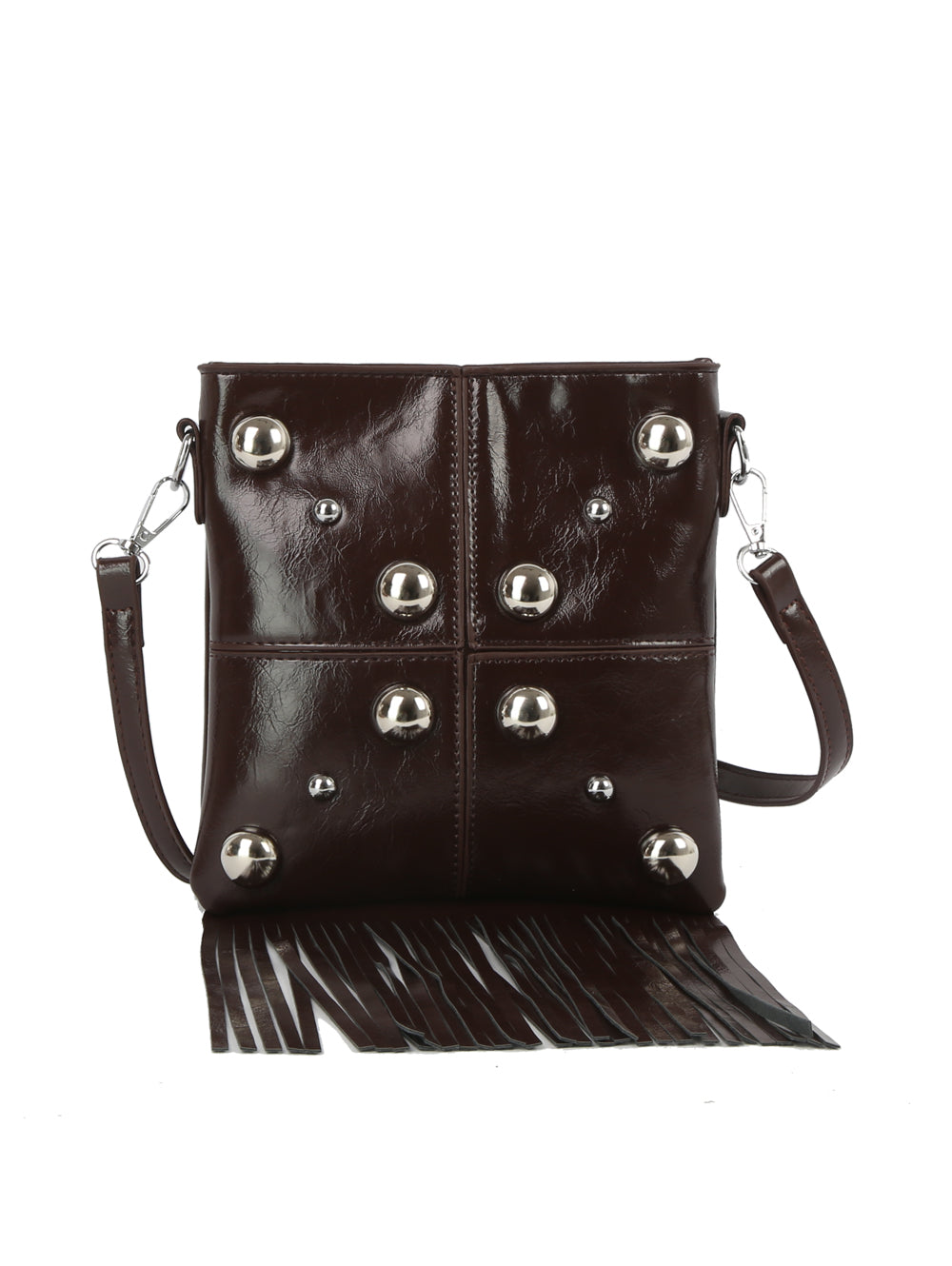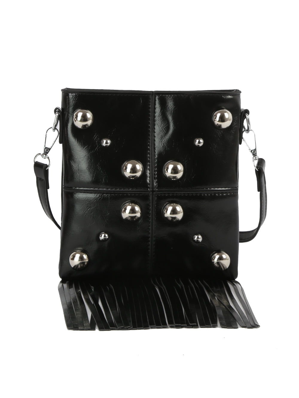 • Faux vegan leather • Detachable strap • Magnetic snap closure • Shoulder bag • Silver-tone dome studs. • Depth: 5.25 Height: 3 Length: 11.75